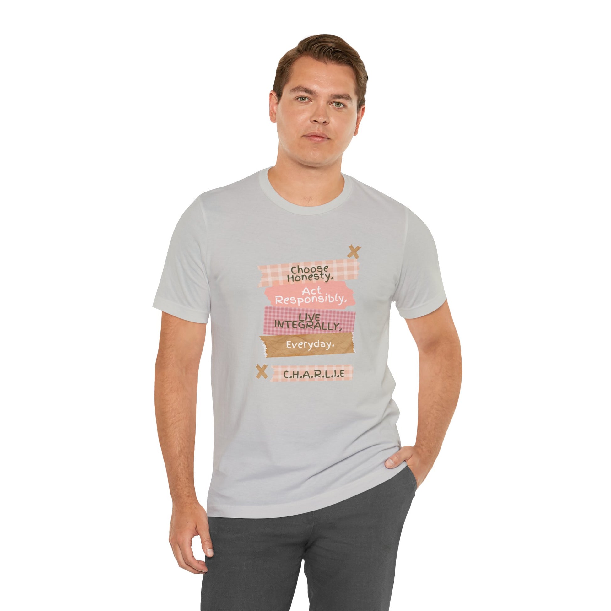 | Soft, breathable, and ethically made — this lightweight jersey tee carries a warm, hand-crafted look that reads like a quiet promise. Layered pastel fabric-strip graphics gently list values in playful, stitched textures finished with a personalised banner. The crew neck and retail fit keep the silhouette neat and wearable, while Airlume combed and ring-spun cotton feels smooth against the skin. Subtle details like side seams, shoulder tape, and a tear-away label mean this shirt keeps its shape, stays comfortable through repeated wear, and won’t irritate. Made and sourced with traceable, certified practices, it’s for people who want a calm, intentional statement in everyday outfits. |