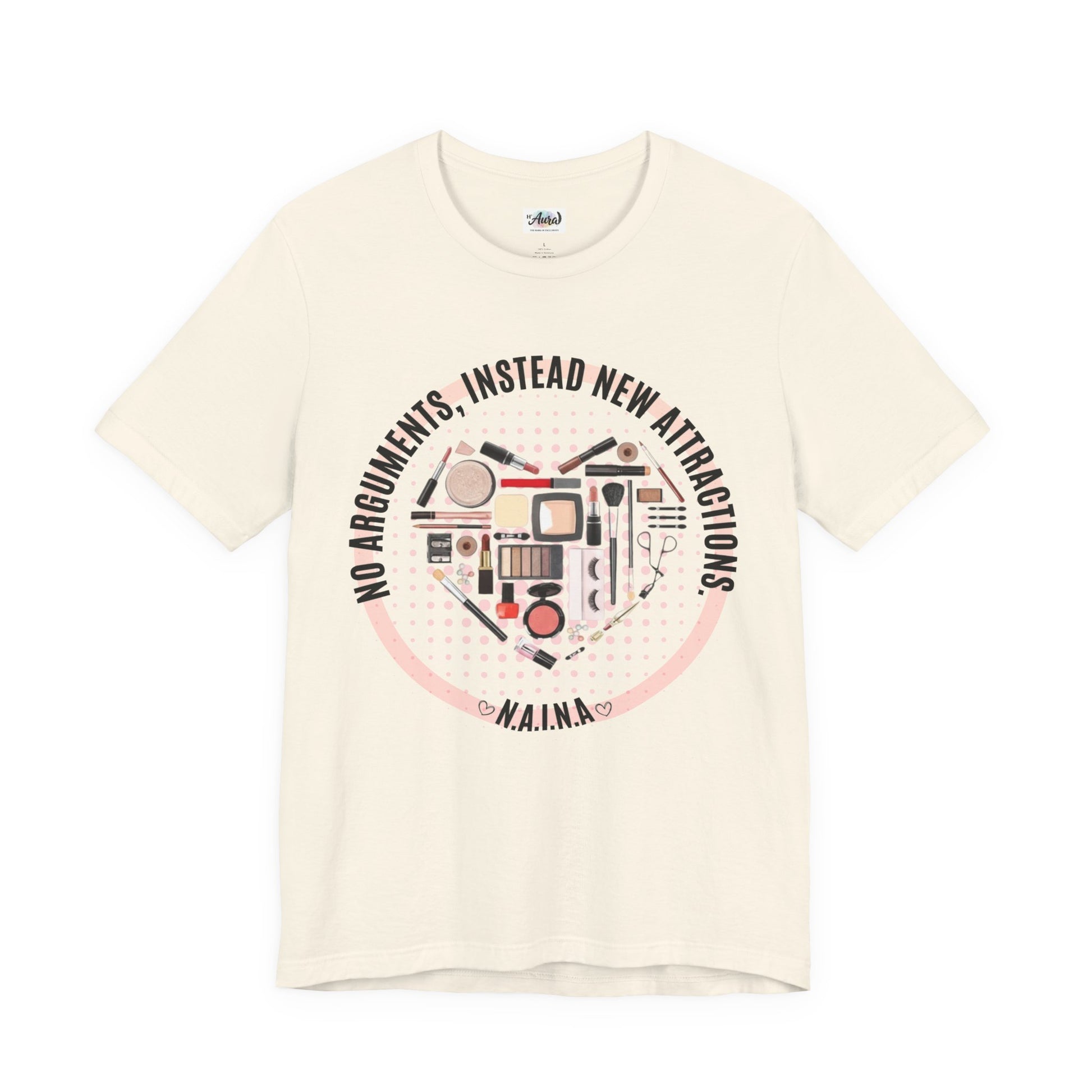 | A soft, breathable jersey tee that blends casual comfort with playful, beauty-inspired graphics. The front features a heart-shaped arrangement of makeup icons framed by the phrase, finished in gentle pink and neutral tones that read as fun and confident. Lightweight Airlume cotton and a clean crew neckline make it easy to layer or wear on its own. Wear it while getting ready with friends, during low-key days out, or whenever you want a subtle, stylish nod to makeup culture and self-expression. |