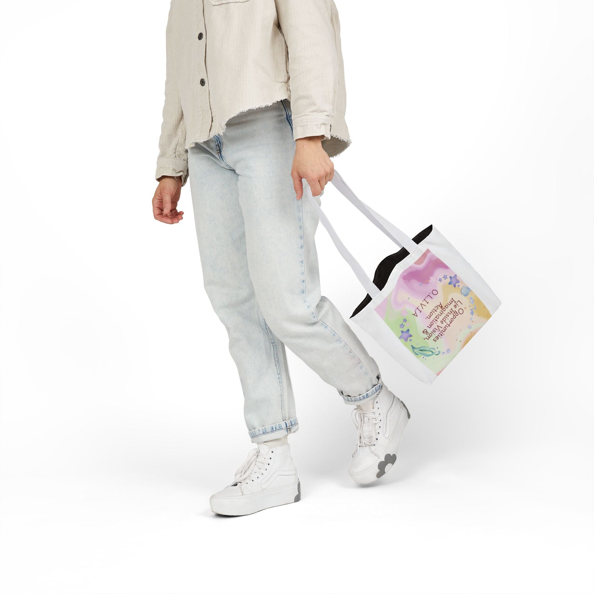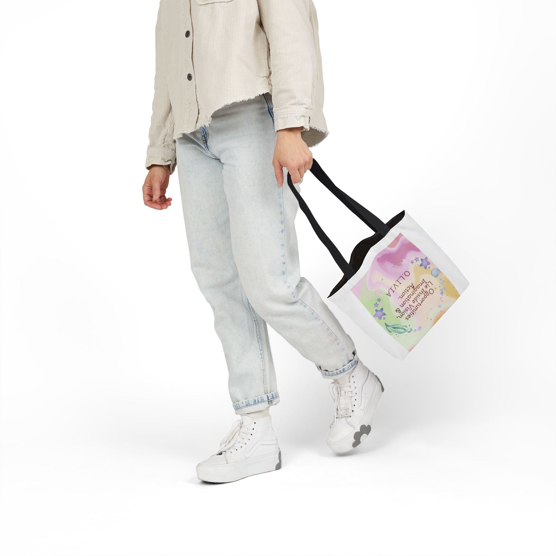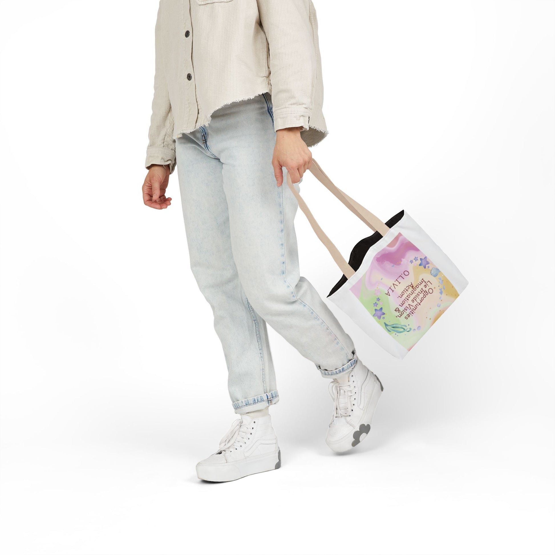 A roomy, personality-forward canvas tote that carries more than just items — it carries a name. Each bag is printed edge-to-edge with a custom quote derived from the recipient’s initials, then dressed in one of five strap colors to match mood or style. The fine-weave polyester canvas feels soft to the touch, and boxed corners give the bag extra room so it holds groceries, sketchbooks, or a day’s worth of market finds without folding in on itself. Vibrant, all-over printing keeps the lettering and artwork lively and bold through daily use. Ships from the US and UK, so your personalized message arrives with care whether it’s across town or across the pond.