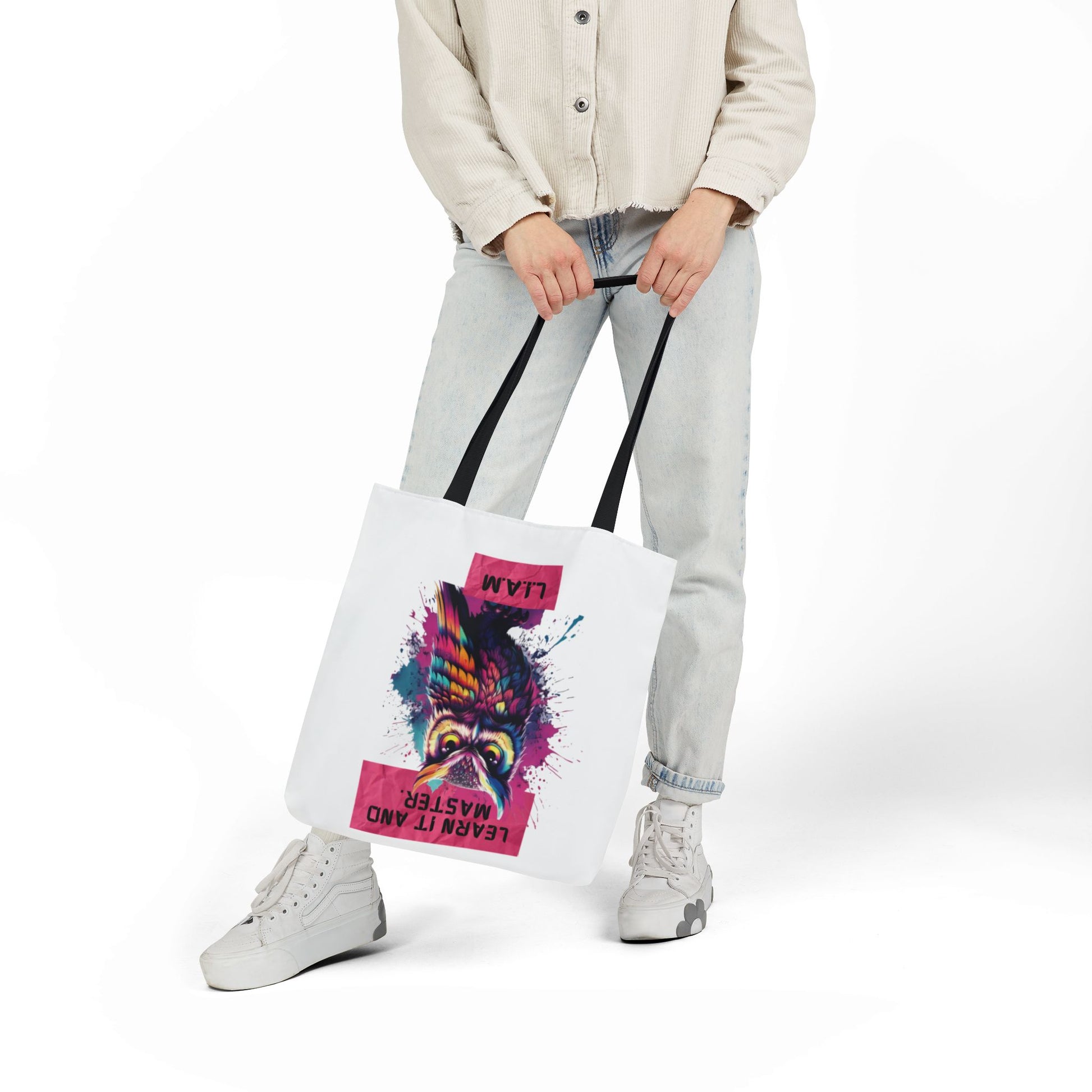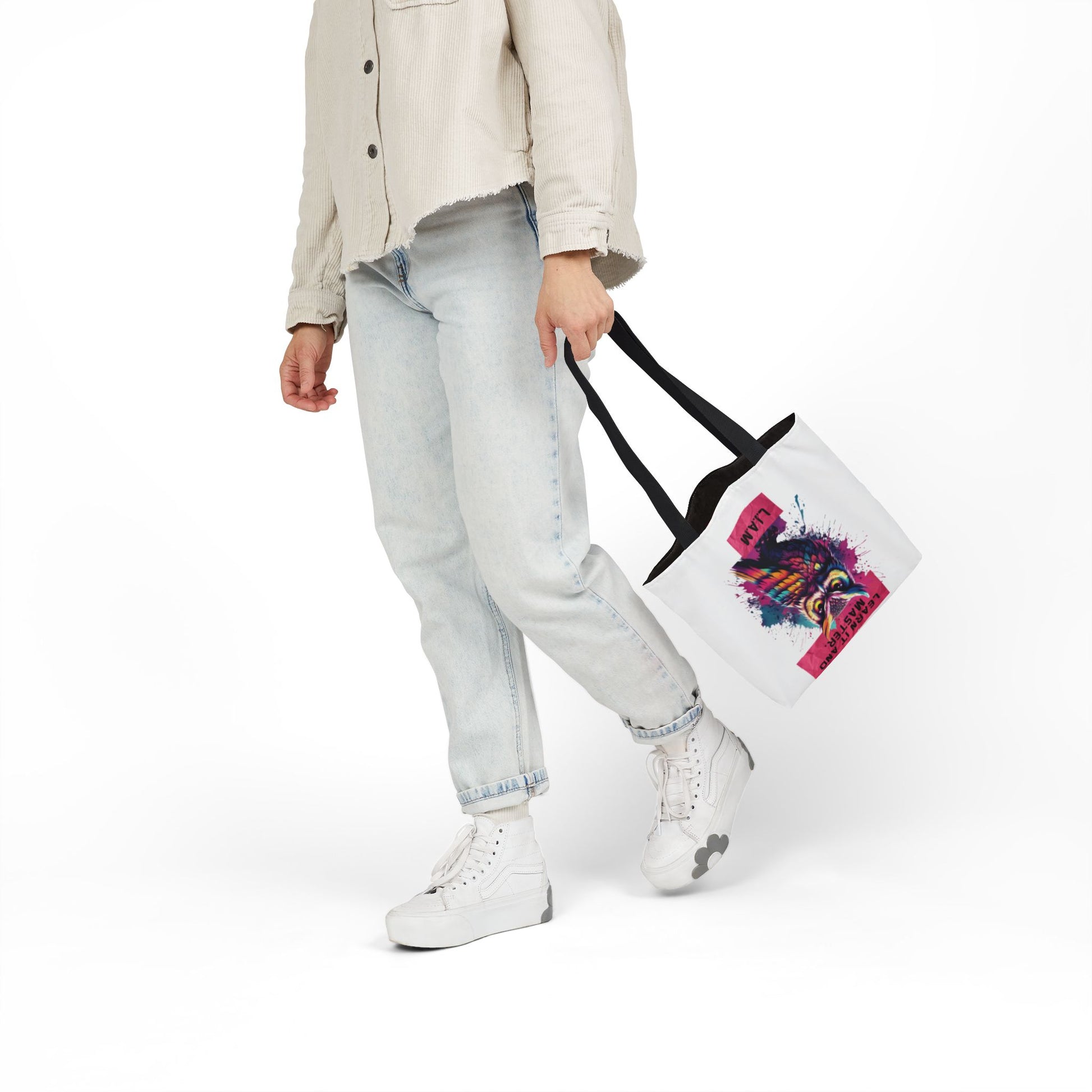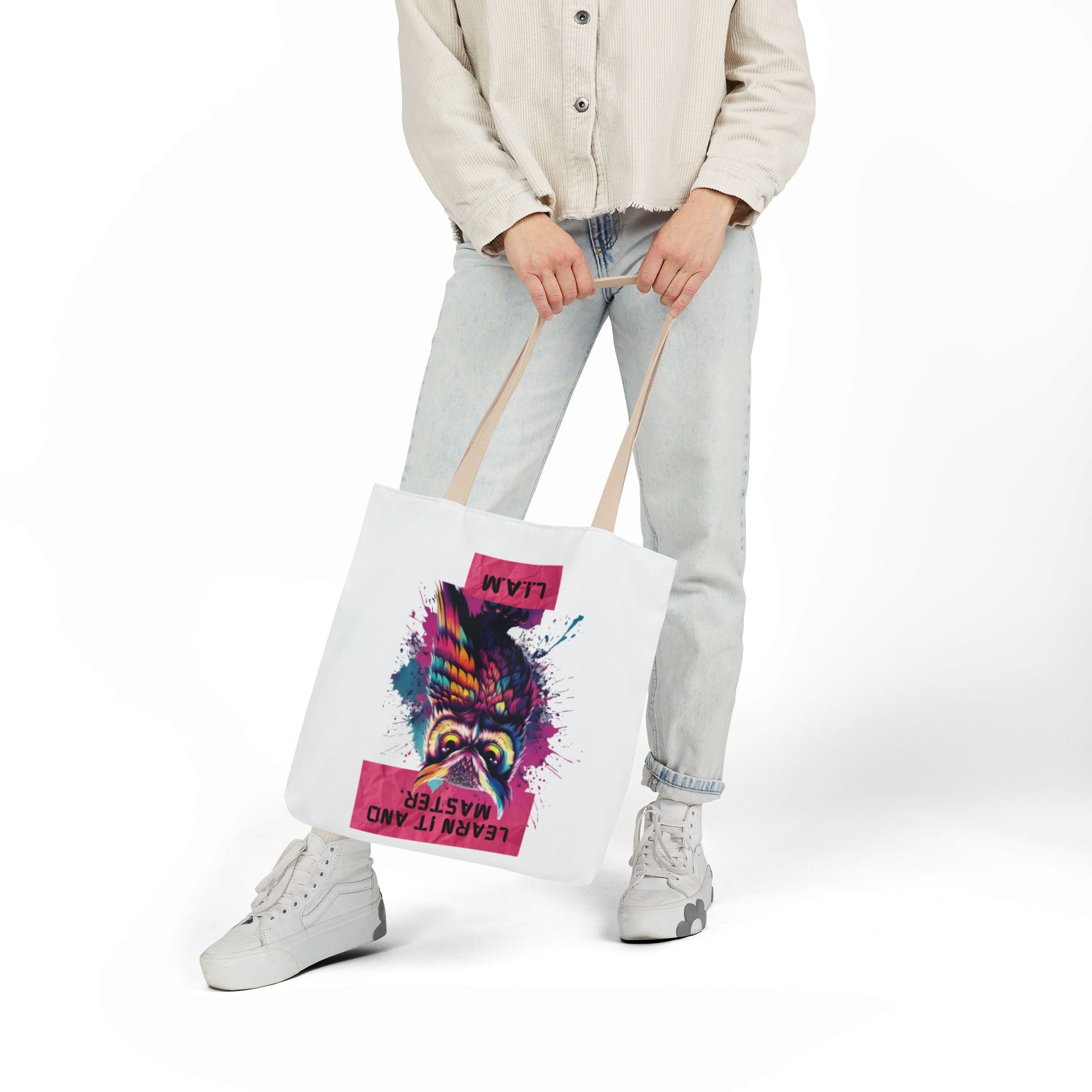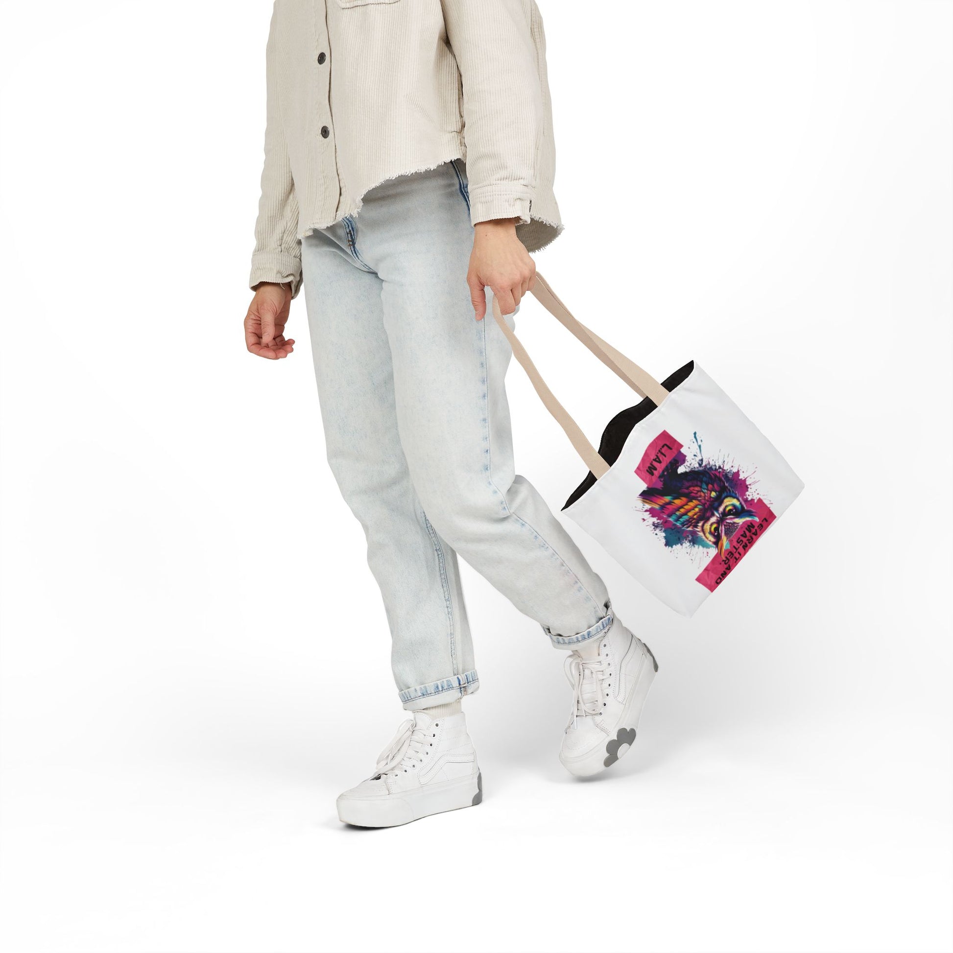 A roomy, personality-forward canvas tote that carries more than just items — it carries a name. Each bag is printed edge-to-edge with a custom quote derived from the recipient’s initials, then dressed in one of five strap colors to match mood or style. The fine-weave polyester canvas feels soft to the touch, and boxed corners give the bag extra room so it holds groceries, sketchbooks, or a day’s worth of market finds without folding in on itself. Vibrant, all-over printing keeps the lettering and artwork lively and bold through daily use. Ships from the US and UK, so your personalized message arrives with care whether it’s across town or across the pond.
