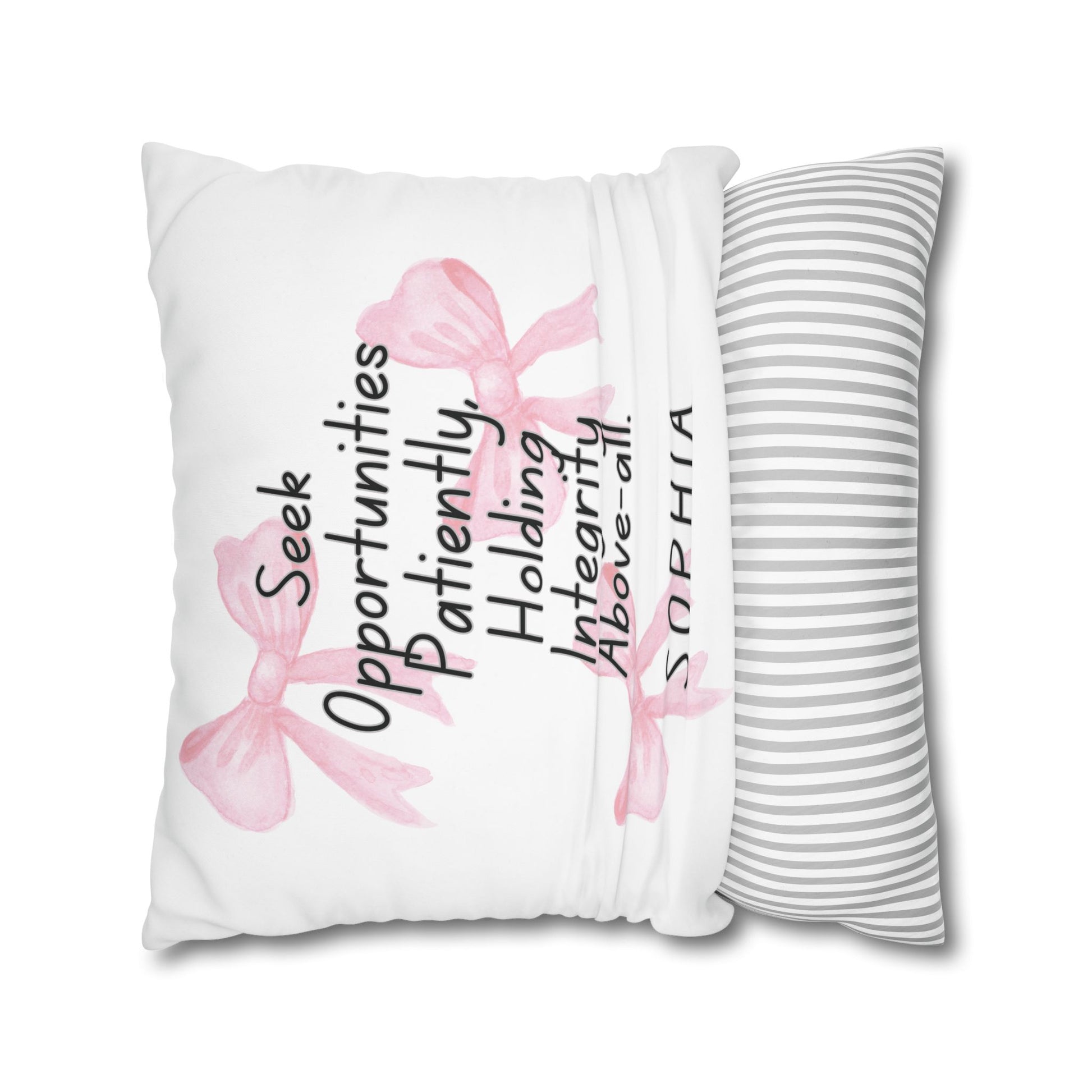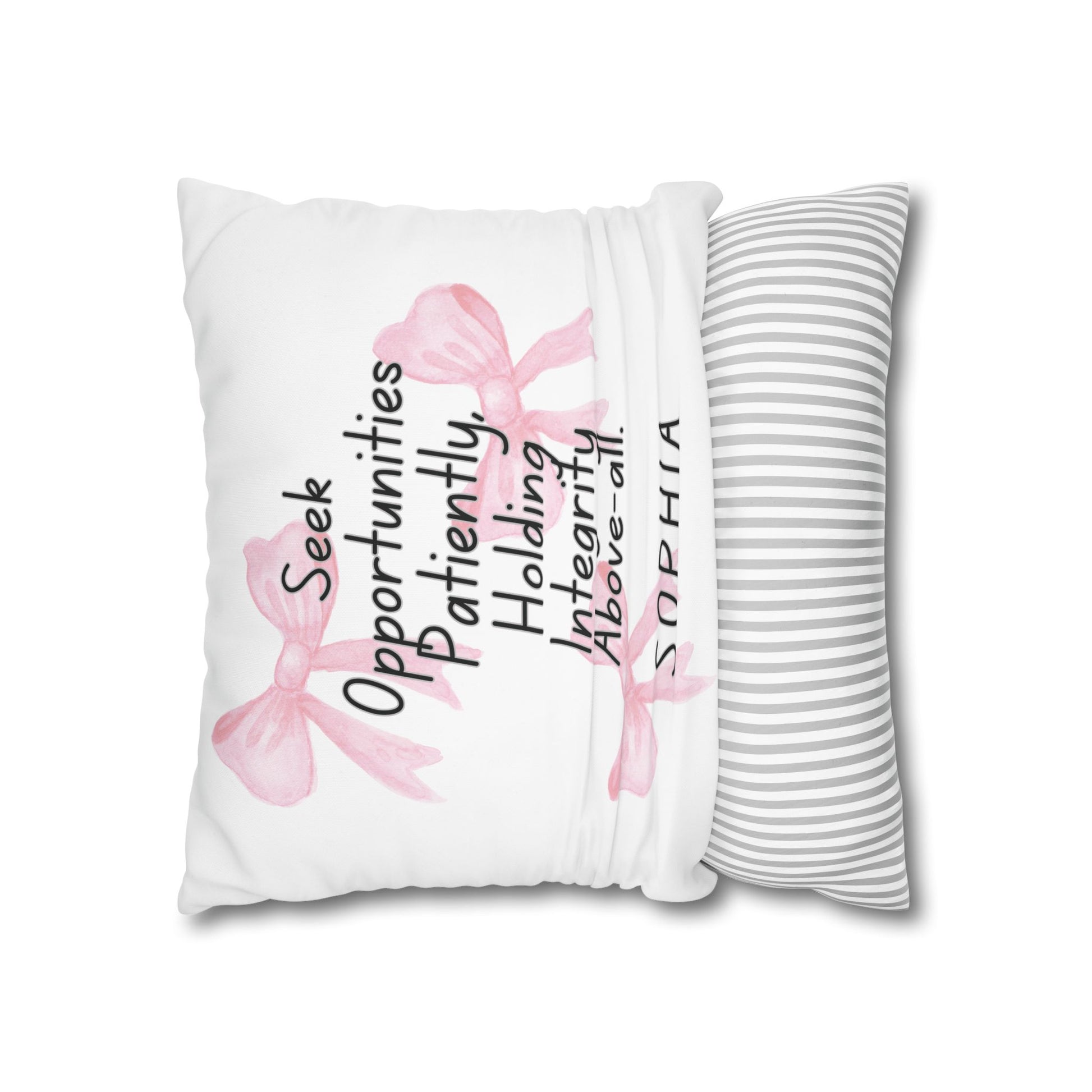Personalized Initial Quote Pink Bow — Custom Sayings on Square Poly Canvas Pillowcase